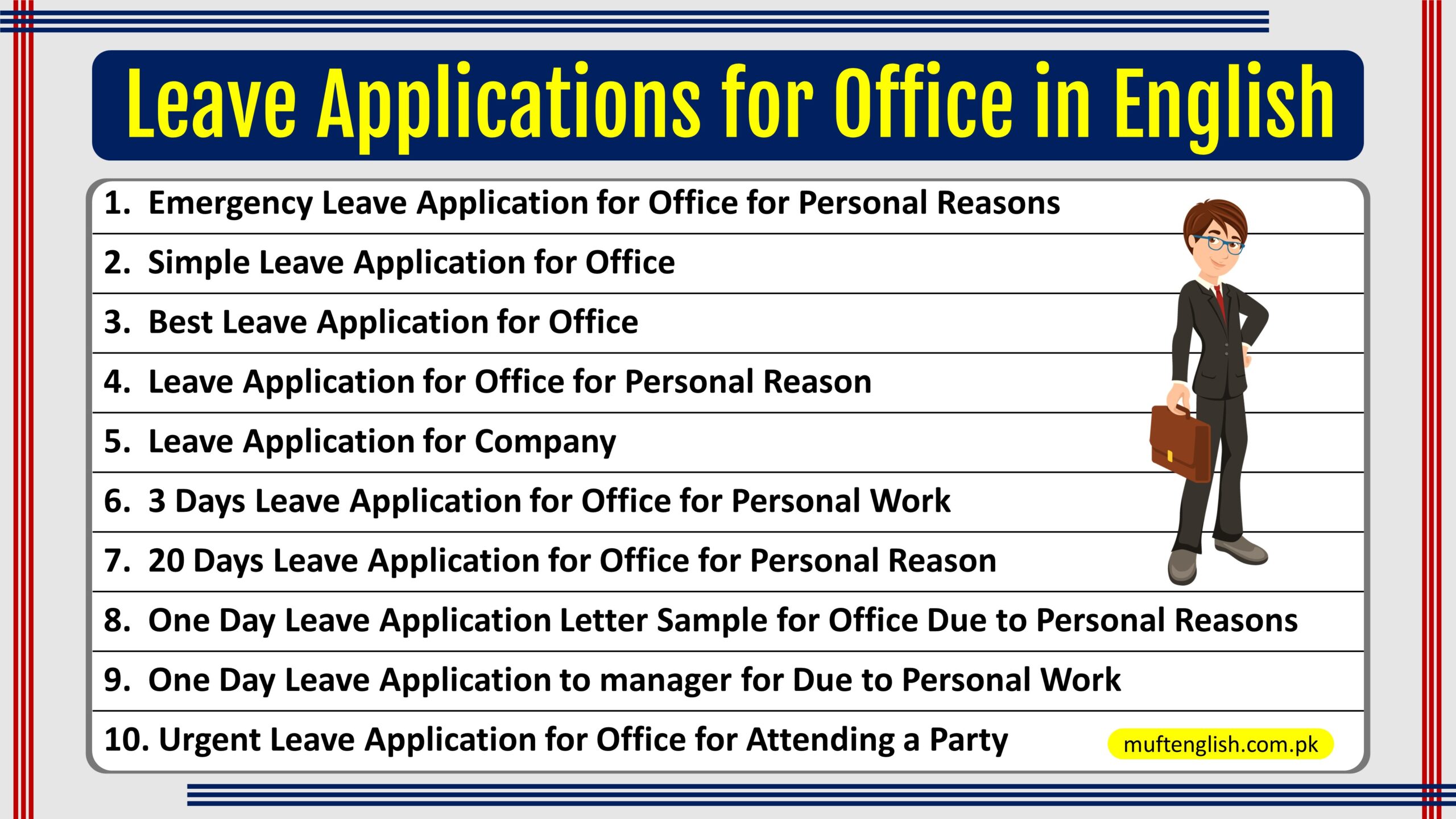 I hope you have found this article amazing and you have got what you were looking for, we have mentioned ten different samples of Leave applications for the Office in English so that you can easily get what is required and at the end of the blog, we have also mentioned the best tips to write an application formally, if you want to write an application next time these tips will amazingly help you.