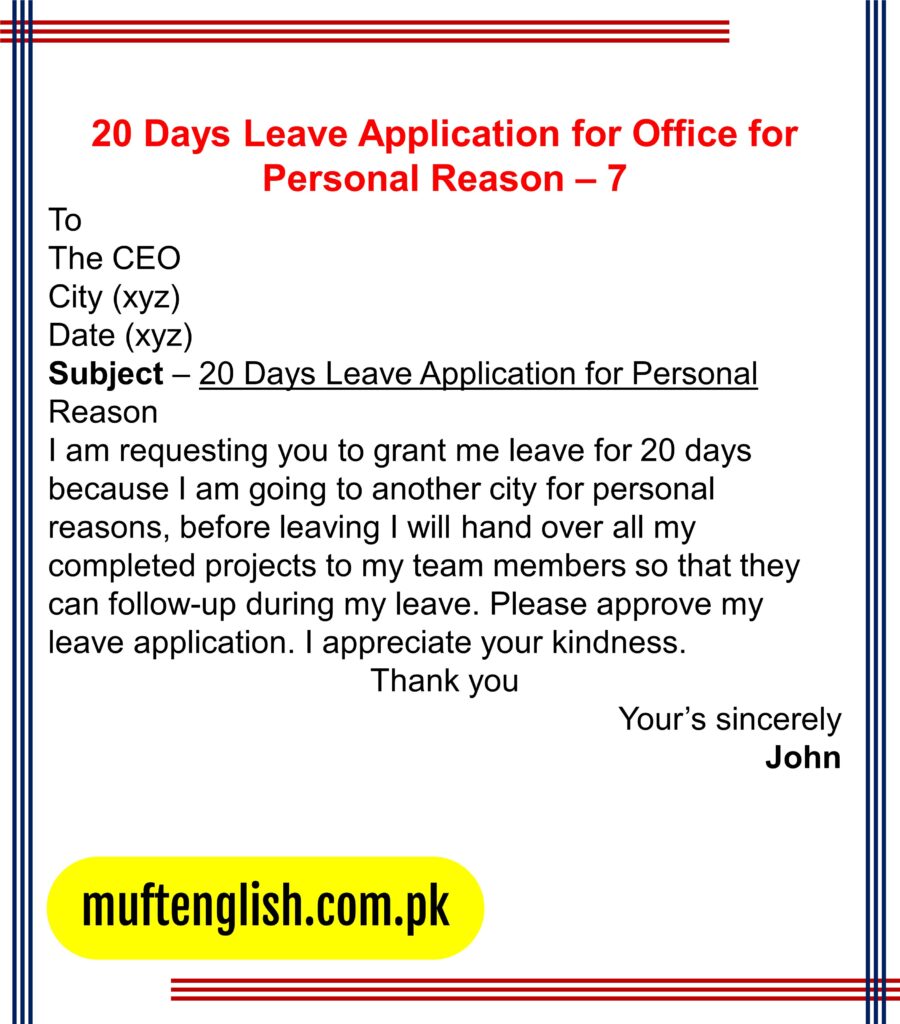 I am requesting you to grant me leave for 20 days because I am going to another city for personal reasons, before leaving I will hand over all my completed projects to my team members so that they can follow up during my leave. Please approve my leave application. I appreciate your kindness.