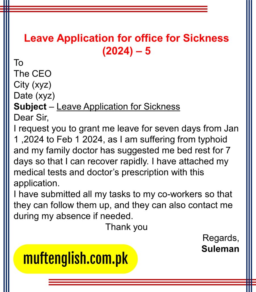 I request you to grant me leave for seven days from Jan 1, 2024, to Feb 1 2024, as I am suffering from typhoid and my family doctor has suggested bed rest for 7 days so that I can recover rapidly. I have attached my medical tests and doctor’s prescriptions with this application.