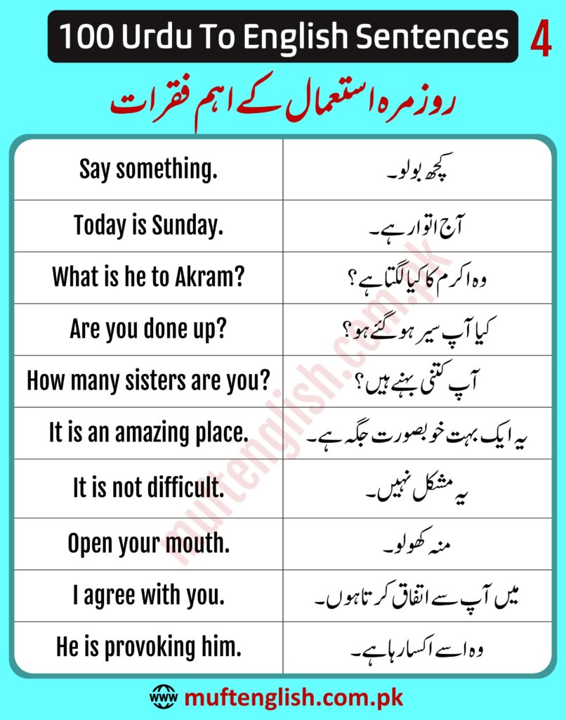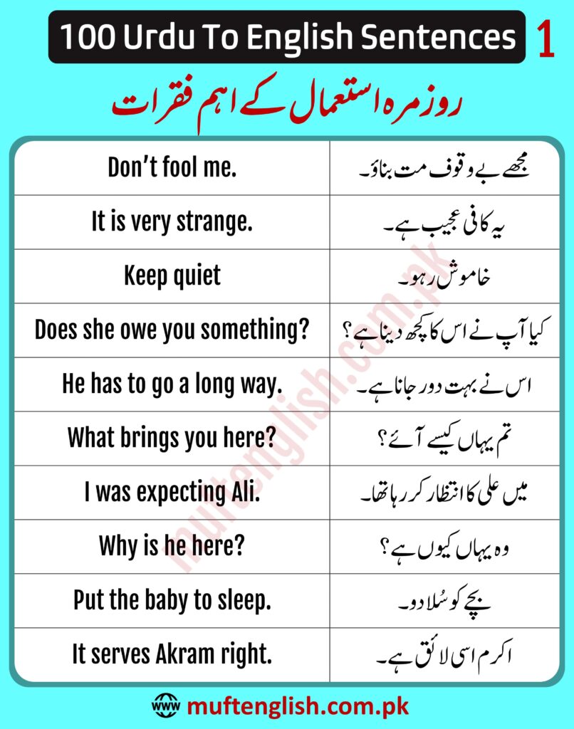 English speaking has become very important these days. English is spoken everywhere and it is considered one of the official languages. If you are a student, teacher, business person, or you have daily conversations with people around you in English so, English is your need. We have prepared this lesson with an amazing 100 sentences so that you can speak fluent English while talking with English-speaking people. These Urdu to English translation sentences will boost your speaking skills.