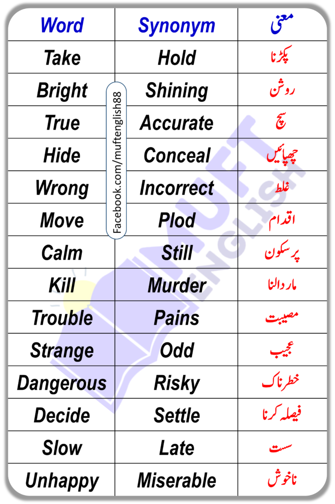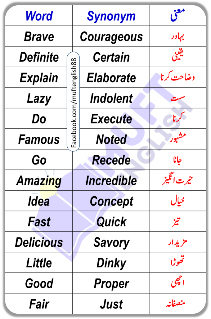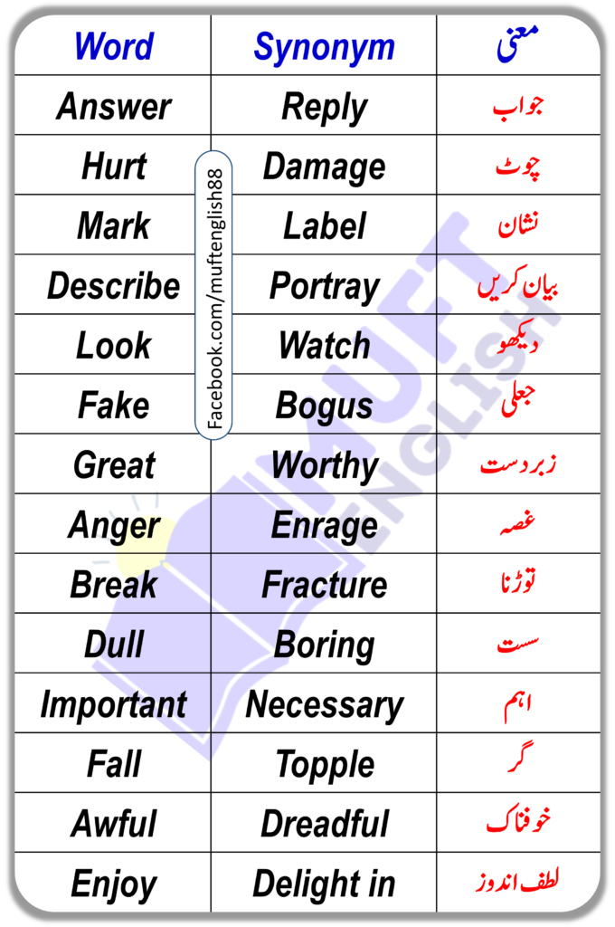 In the following blog, we will be learning some synonyms and also what they are called in Urdu. These words will be beneficial for the students who are trying to learn English. It will not only help you improve your speaking skills it will also help you gain knowledge of new words and use alternative words when needed.