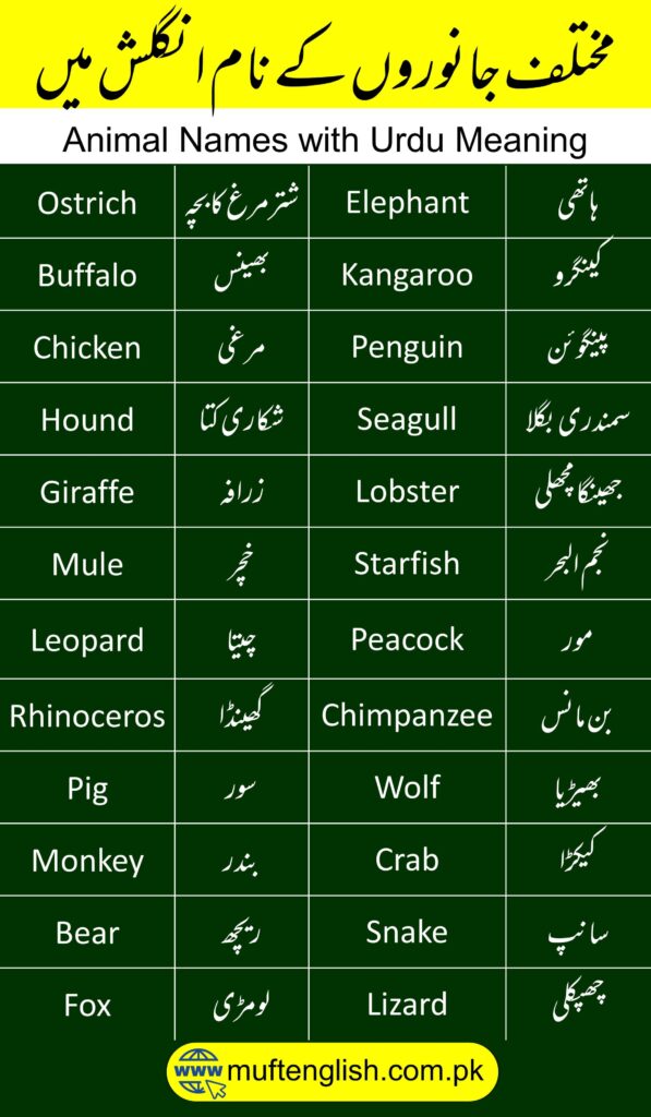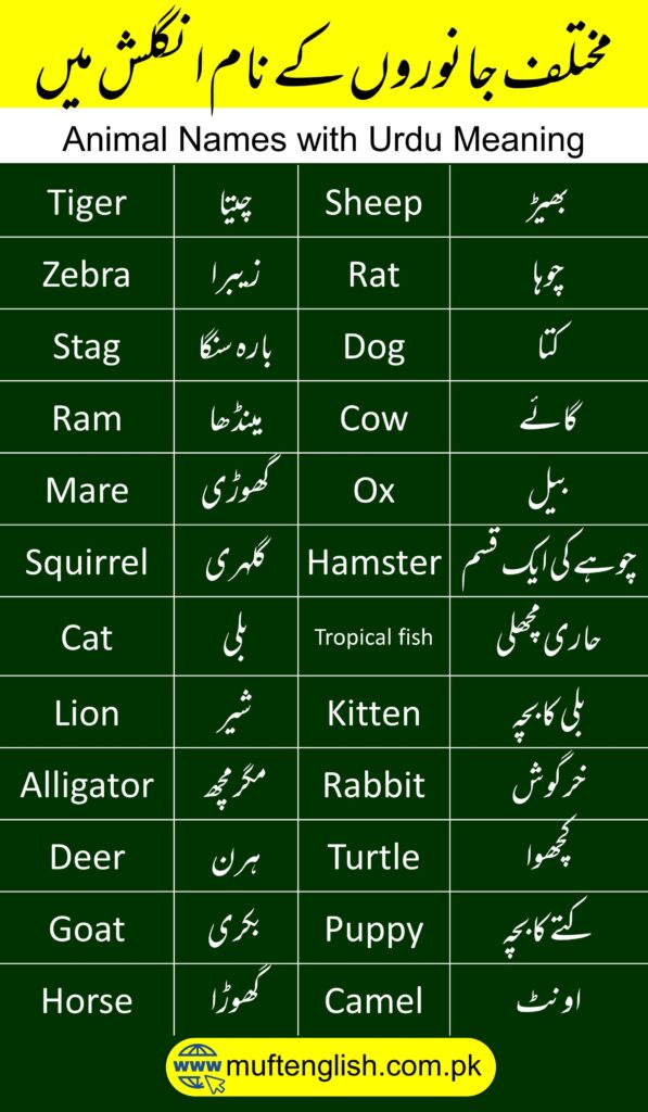 This lesson is specially prepared for the kids as they need this vocabulary list in their schools, and parents must teach their children these animal names with Urdu meanings so they can become familiar with these words. Read this lesson carefully and understand the names of animals, use these words with your friends while talking about animals. You can get the PDF of this lesson below and revise this lesson when needed.