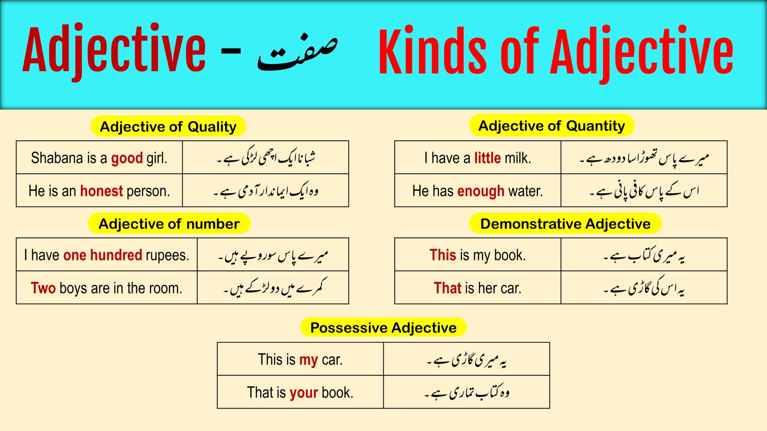 Kinds of Adjective with English and Urdu Examples