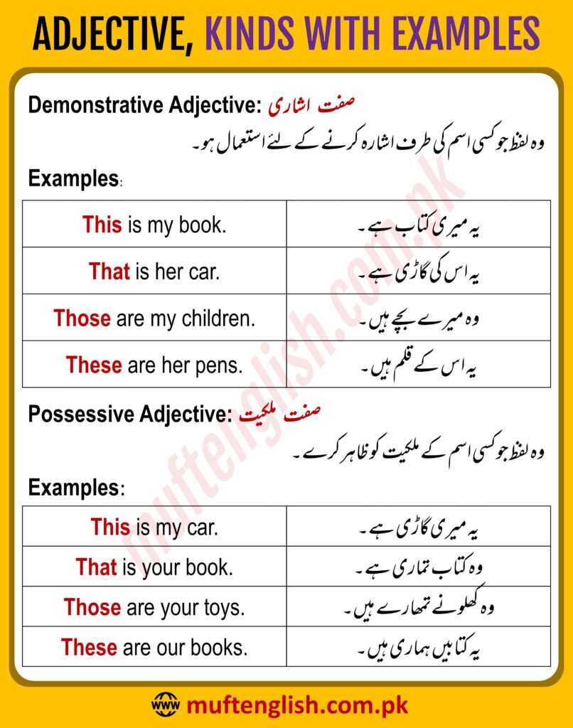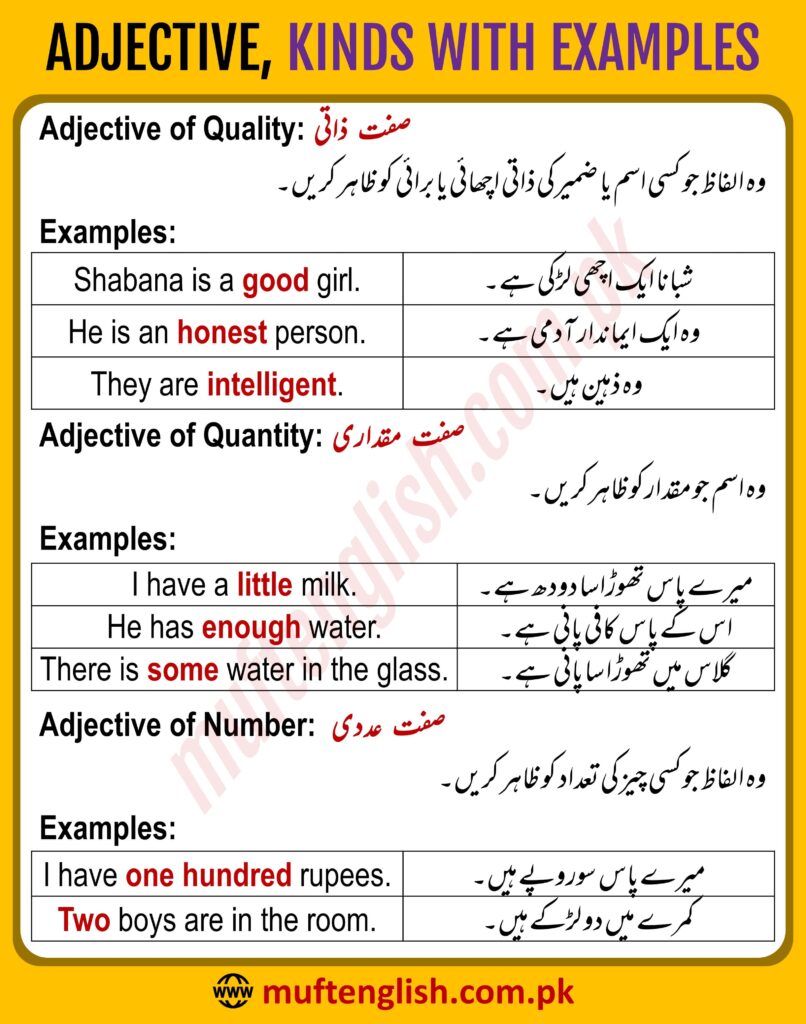 In this blog, you will learn what an adjective is, and the kinds of adjectives with English and Urdu examples. Adjective is an important part of speech generally used for different purposes like, quality, number, quantity, etc. These are used to add some clear meaning to the noun and pronoun.