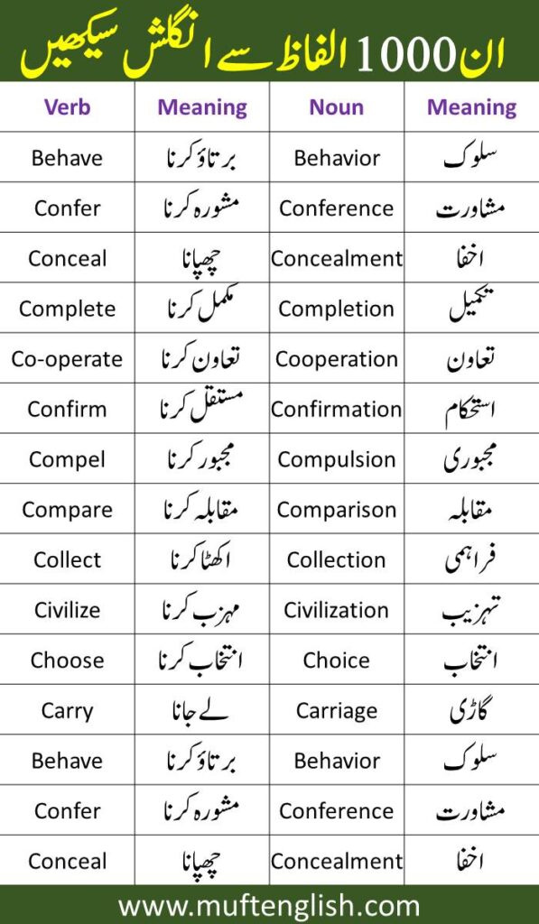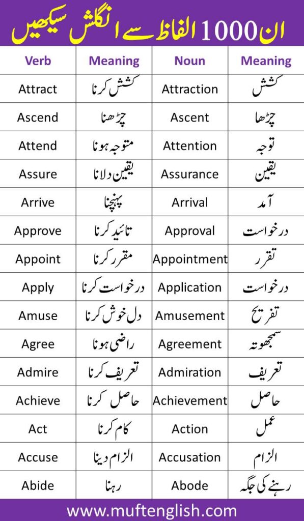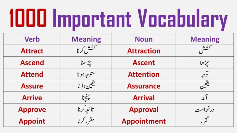 This list has 1000 words with their Urdu meanings and learning these words will not only improve your English speaking but also reading and listening learn these words with their correct meanings and practice them in your daily routine at the end of this blog we are going to provide you these words in picture format so that you can save them and learn them whenever your want.