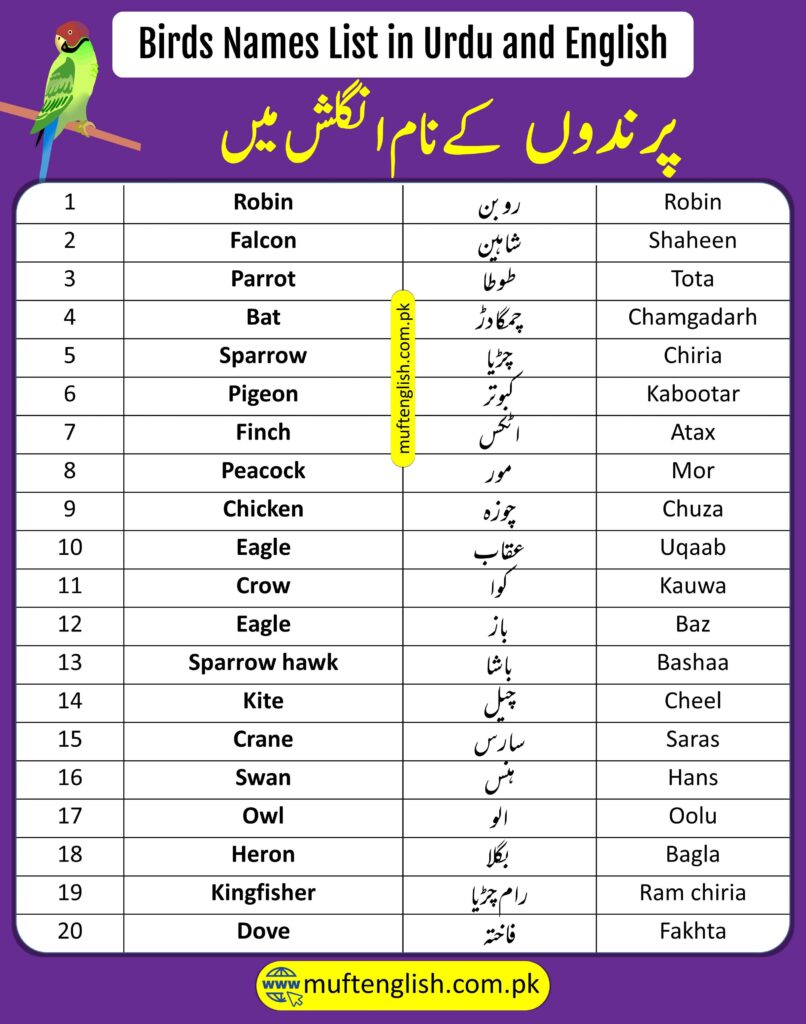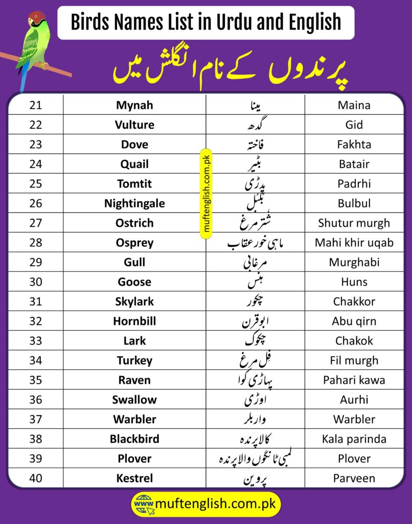Here we have mentioned the 40 most common birds names with Urdu meanings and below we are providing you a PDF lesson so that you can learn this list of birds vocabulary later.