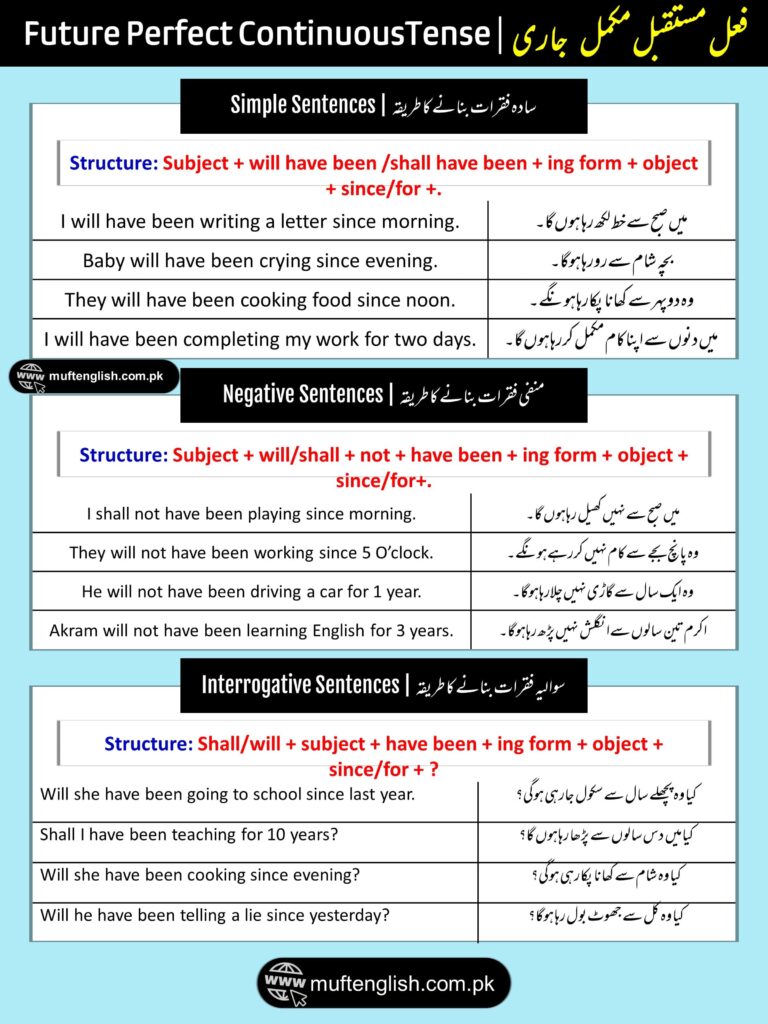Get the PDF of the future perfect continuous tense below and start learning this tense with structures and examples and Urdu meanings.