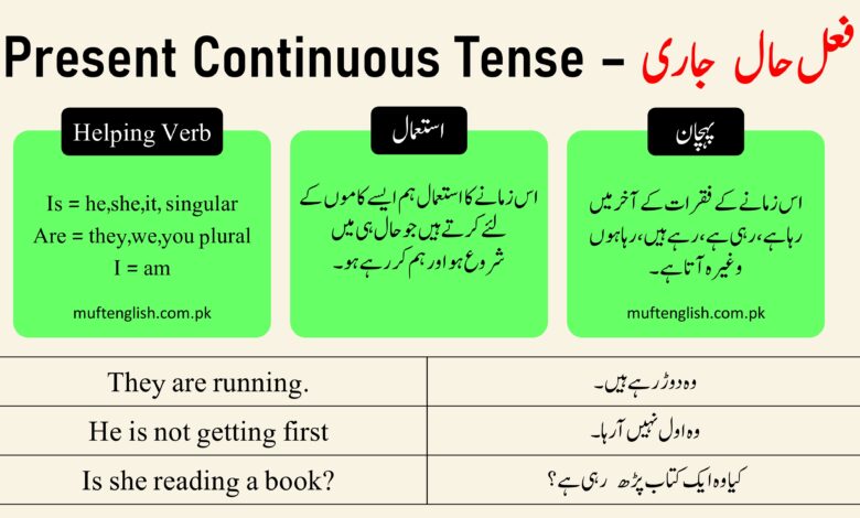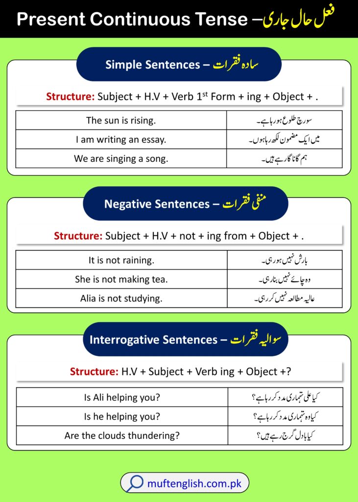 پہچان: اردو فقرات کے آخر میں رہا ہوں’ رہےہیں’ رہا ہے’ رہی ہے، وغیرہ آتا ہے۔