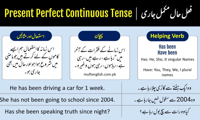اردو میں اس زمانے کو فعل حال مکمل جاری کہتے ہیں اس زمانے کا استعمال ہم ایسے کاموں کے لئے کرتے ہیں جو ماضی میں شروع ہواتھا اور ابھی موجودہ وقت تک جاری ہے۔