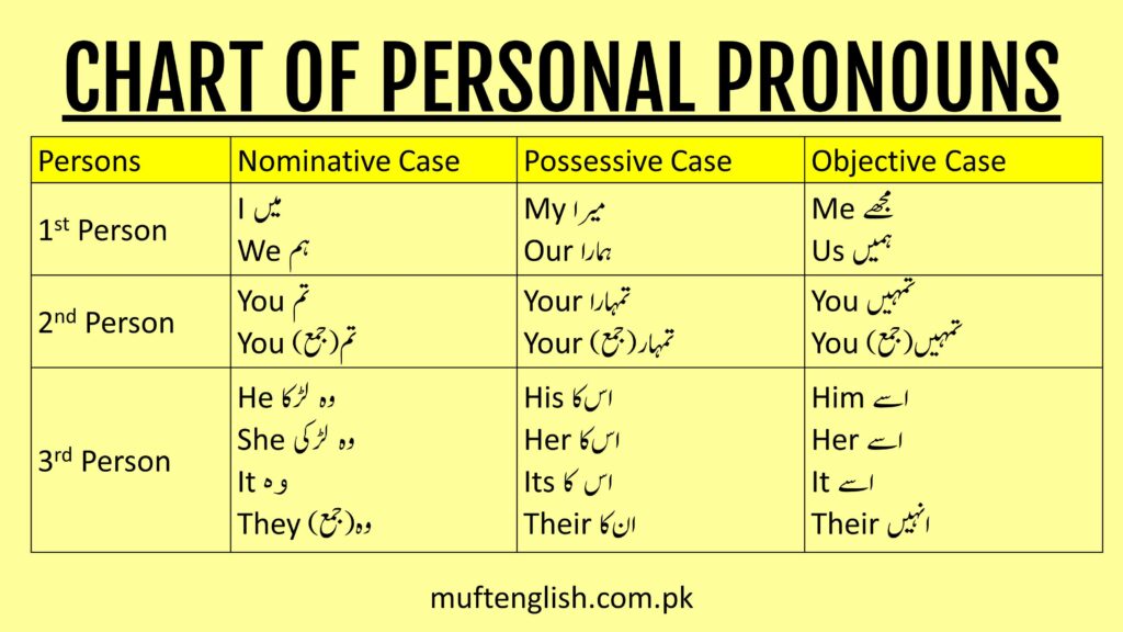 | 3rd Person | He وہ لڑکا She وہ لڑکی It وہ They وہ (جمع) | His اس کا Her اس کا Its اس کا Their ان کا | Him اسے Her اسے It اسے Their انہیں |