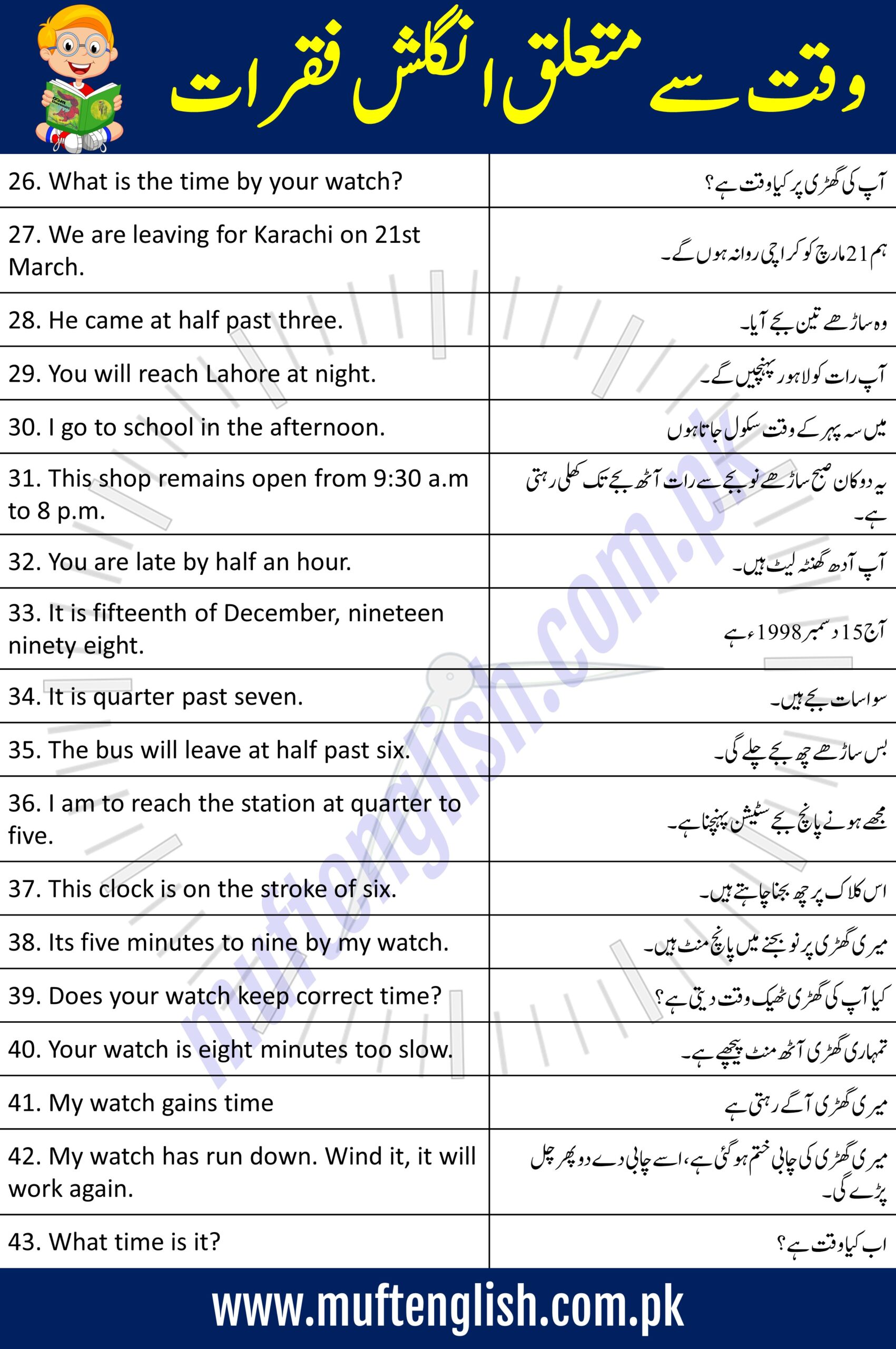 | 45. It’s sic thirty (six fifteen, a quarter to six, ten minutes to six, ten minutes past six). | ساڑھے چھ ( سوا چھ، پونے چھ، چھ بجنے میں دس منٹ، پانچ چھ دس منٹ ) بجے ہیں۔ |